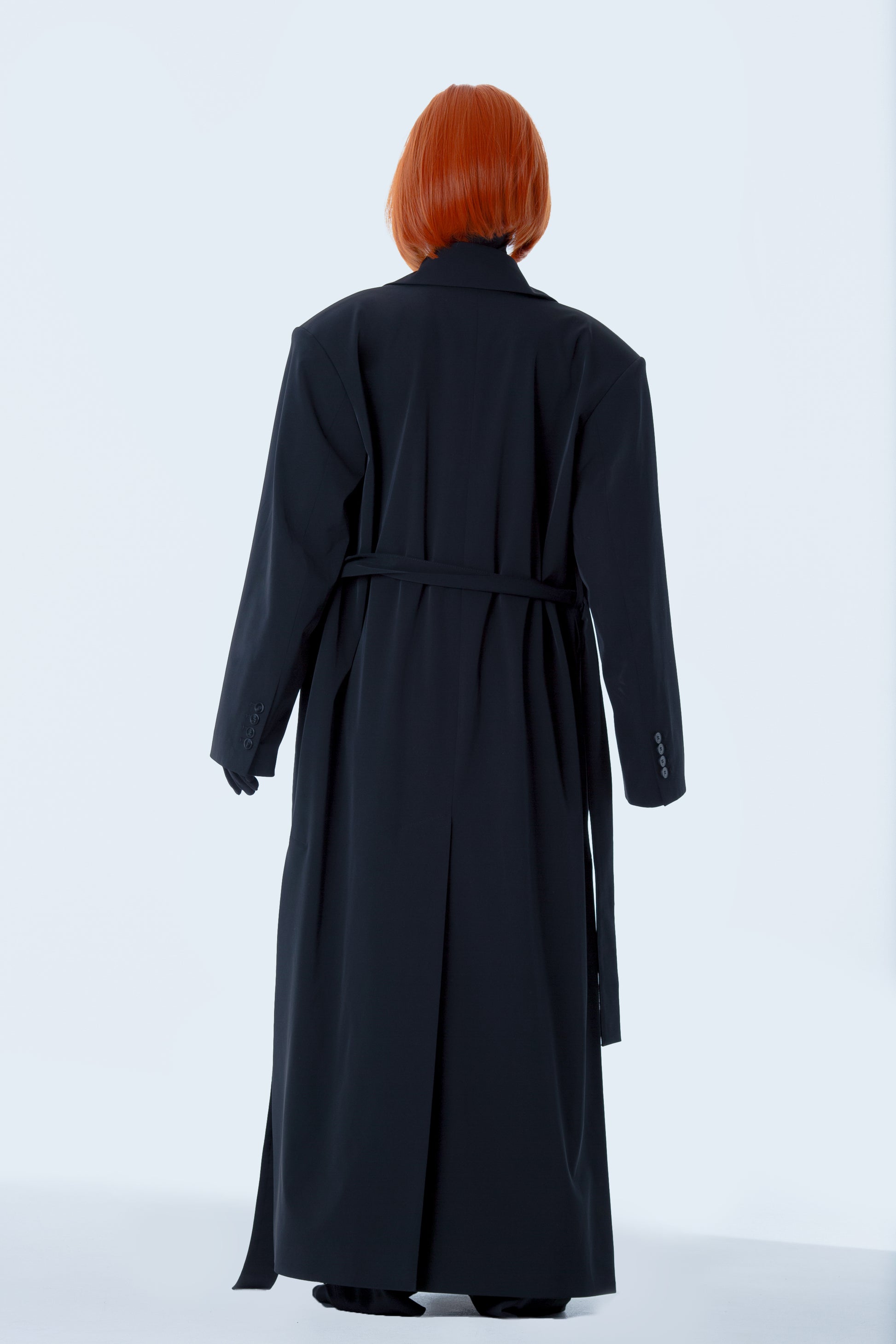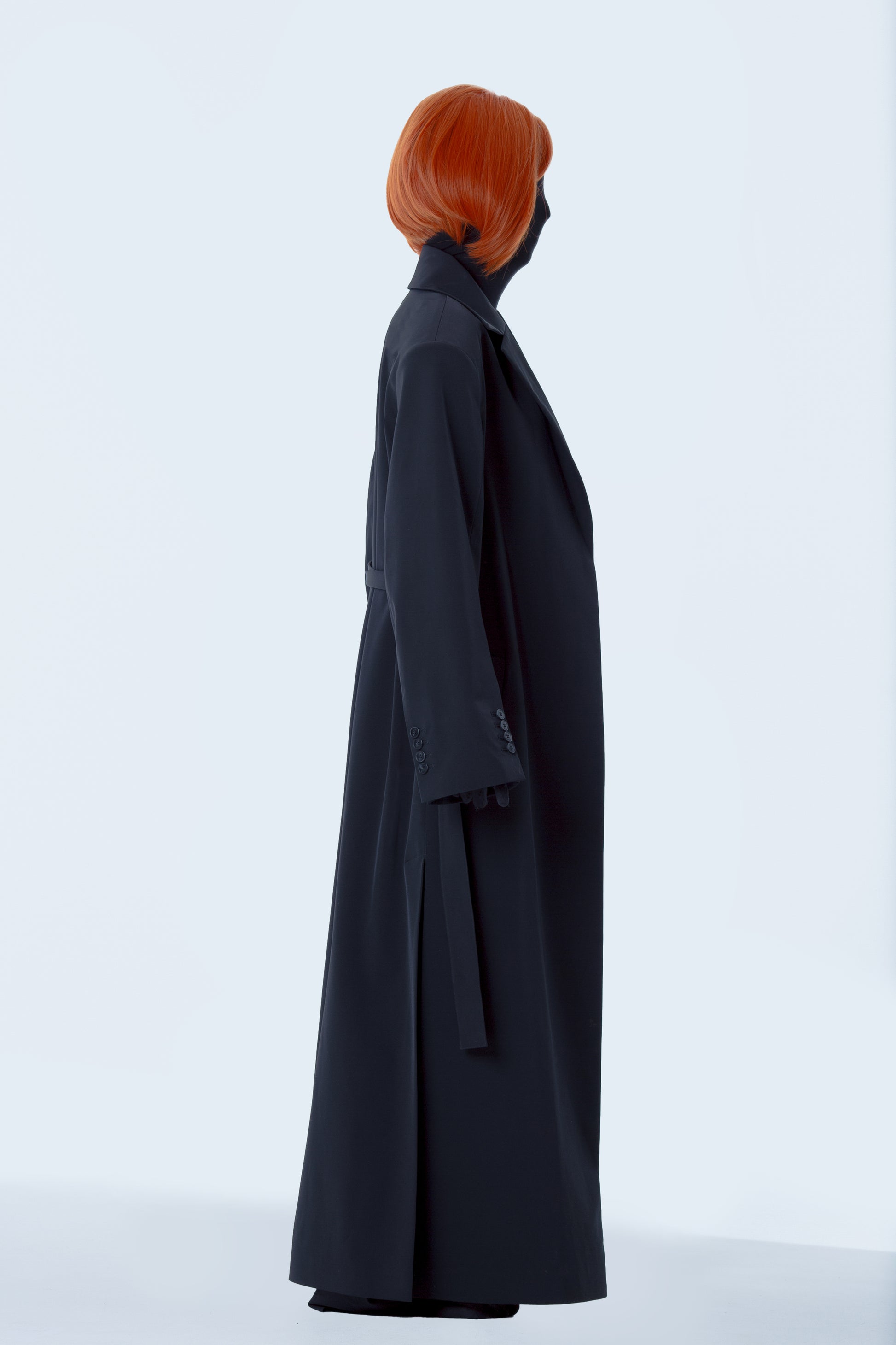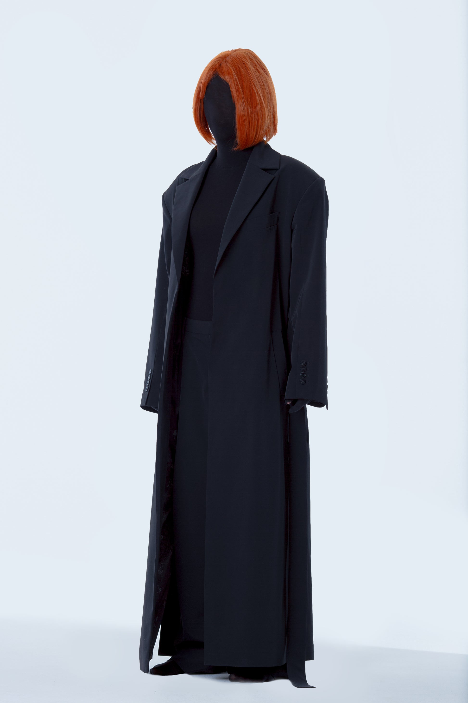 Single-breasted front closure, structured lapel, and extended silhouette.