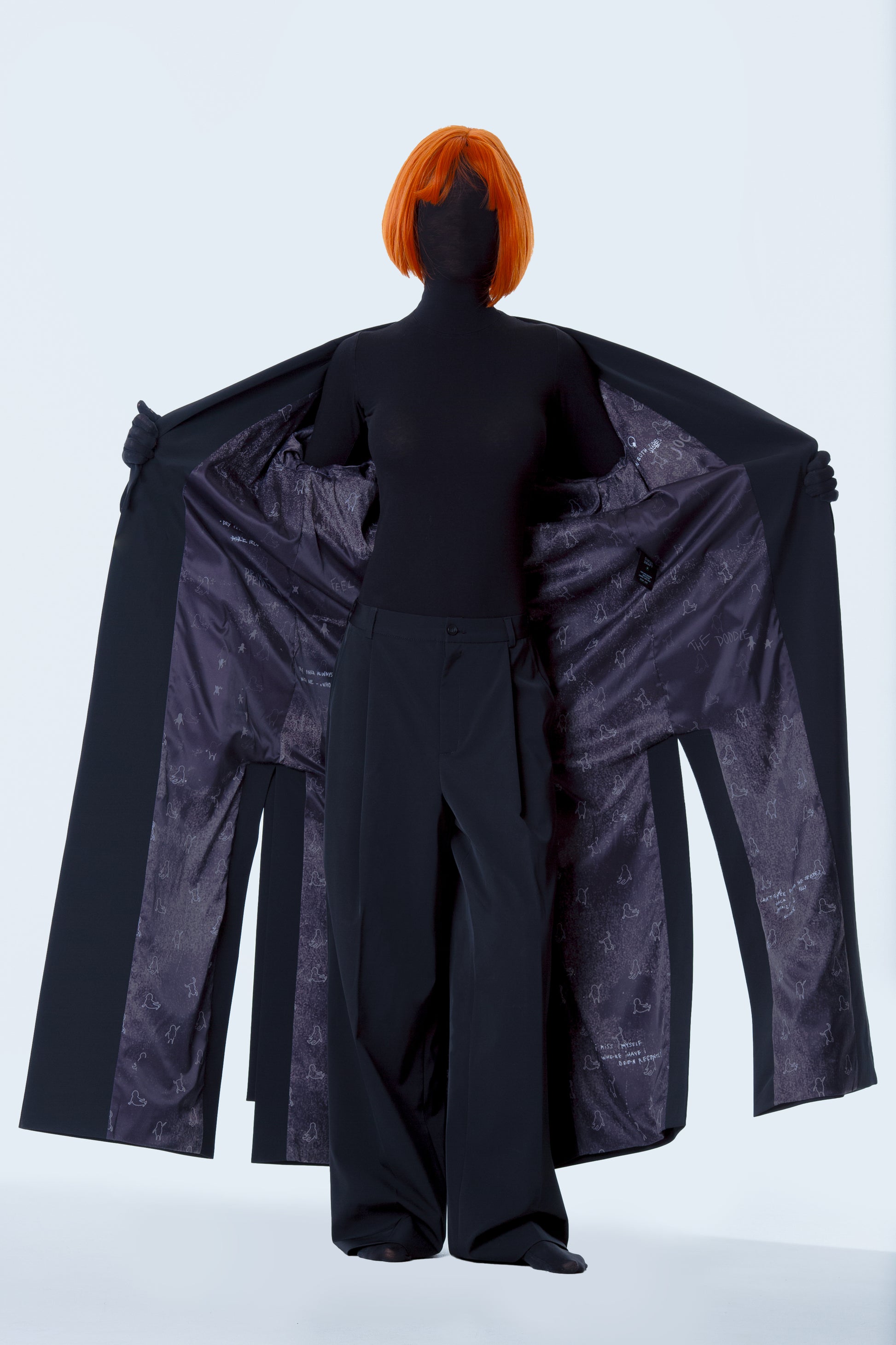Oversized unisex long coat with printed lining and waterproof fabric finish.