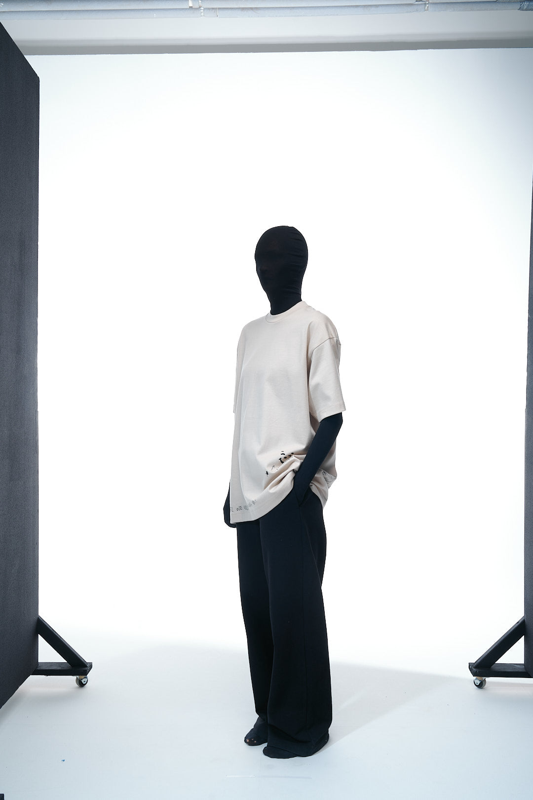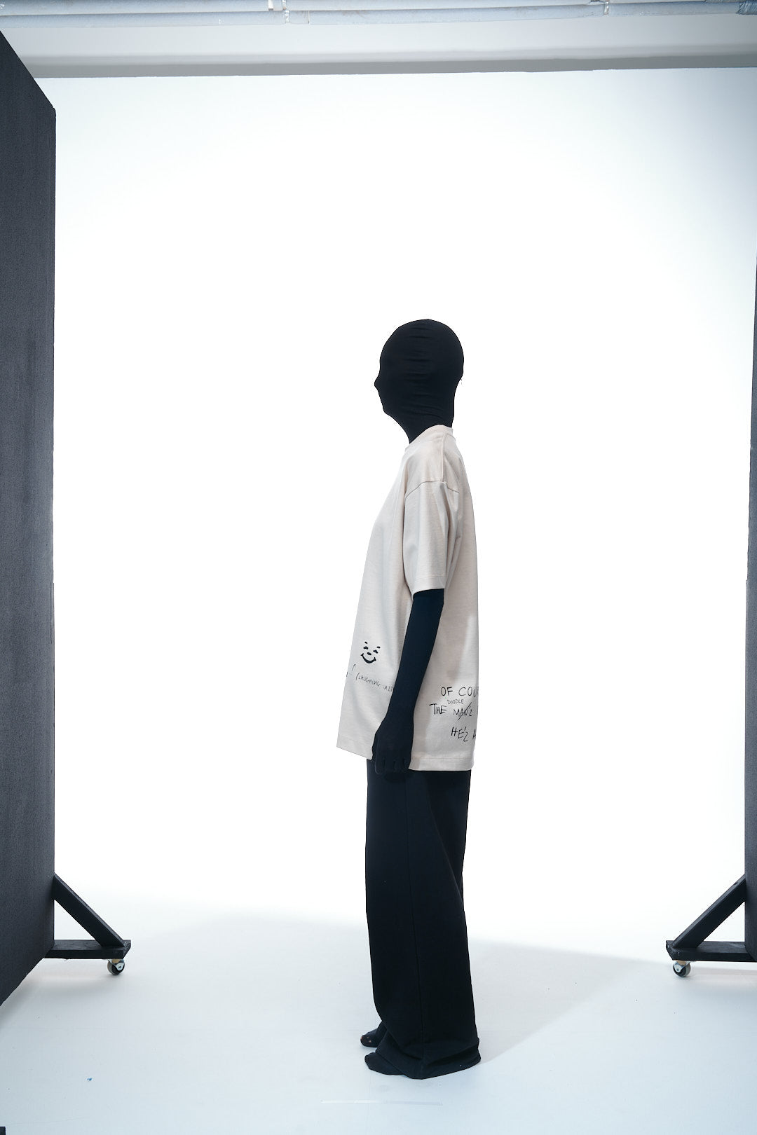 Front: Printed hand-drawn graphics at front hem - "WHAT TIMES WE MUST BE LIVING IN?" and right front detail - abstract smile detail with "(LAUGHING INSIDE)" text “OF COURSE THE DOODLE IS FUNNY, HE’S A LUNATIC” print detail at back hem