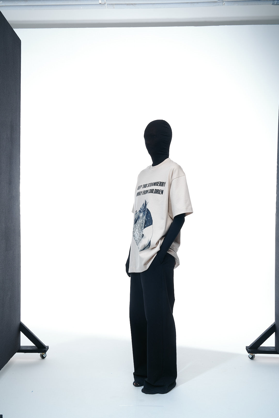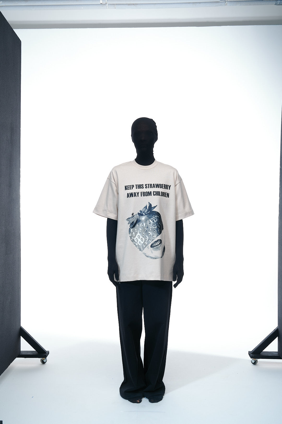 Front: Collaged visual of a strawberry partially masking a screaming human face, including playful typography: “KEEP THIS STRAWBERRY AWAY FROM CHILDREN”
