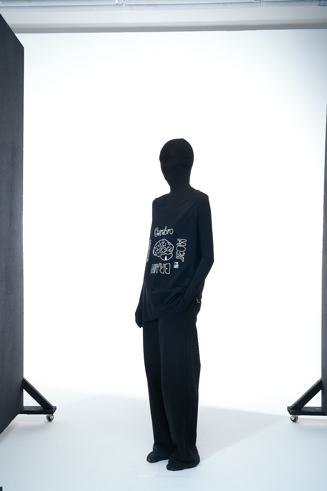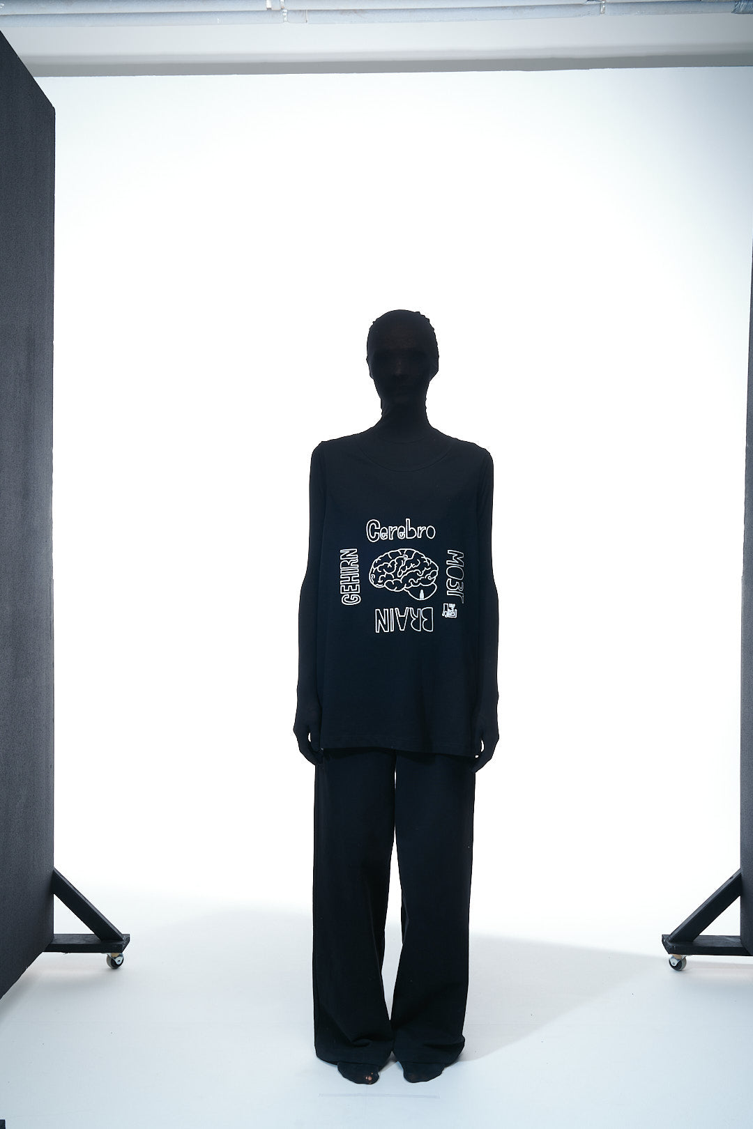 Front: Central line-art illustration of a brain, the word “brain” translated in multiple languages Conceptual reference to multilingual overload and introspective isolation.